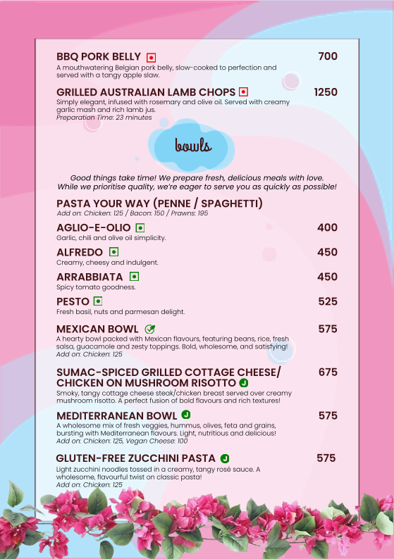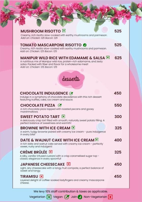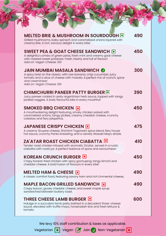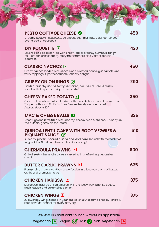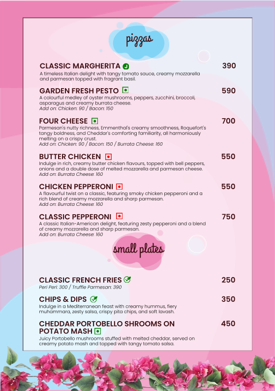 The menu is a vibrant tapestry of flavors, with something for everyone. Start with their Classic Margherita Pizza, an Italian classic featuring a tangy tomato base, creamy mozzarella, and aromatic basil for just ₹390. If you're in the mood for something more adventurous, the Garden Fresh Pesto pizza brings together a colorful medley of vegetables, topped with creamy burrata cheese for ₹590. Pair your meal with their Cheddar Portobello Shrooms on Potato Mash, where juicy mushrooms bursting with flavor rest on a bed of creamy mash, elegantly complemented with tangy tomato salsa for ₹450.